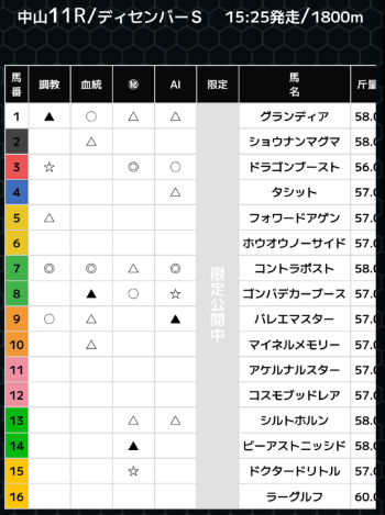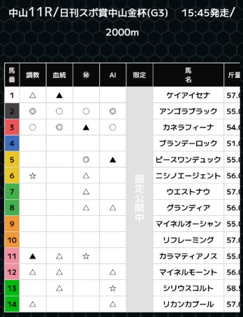 でも、気になるから新規登録をして5日(月)の中山11Rの無料予想を買ってみたら